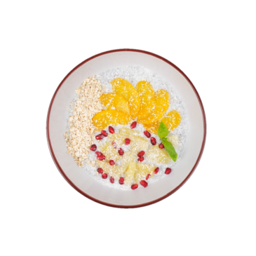 -joghurt zabpehellyel, chia maggal, őszibarackkal, ananásszal, kókusszal és gránátalmával 200 g